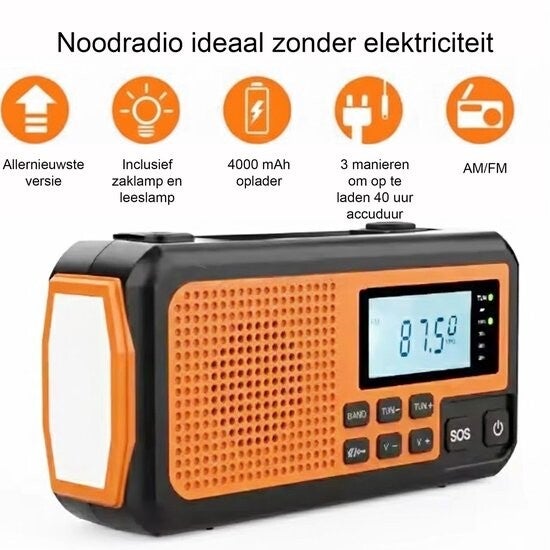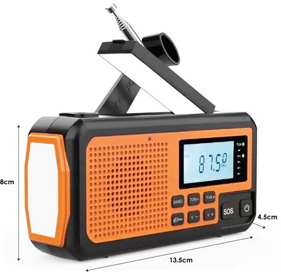 - Functies: radio, zaklamp, powerbank, SOS-alarm