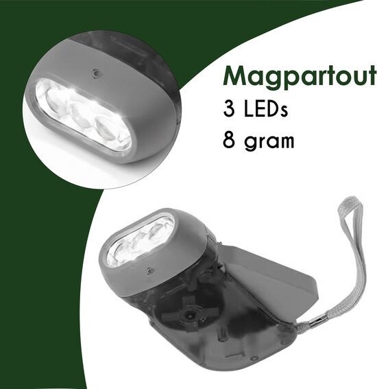 De Magpartout hand-aangedreven knijpkat is een betrouwbare noodzaklamp die werkt zonder batterijen of externe voeding. Dankzij de ingebouwde dynamo en drie LEDs biedt hij licht wanneer je dat het meest nodig hebt — ideaal voor noodsituaties, kamperen, stroomuitval of als vast onderdeel van een noodpakket.